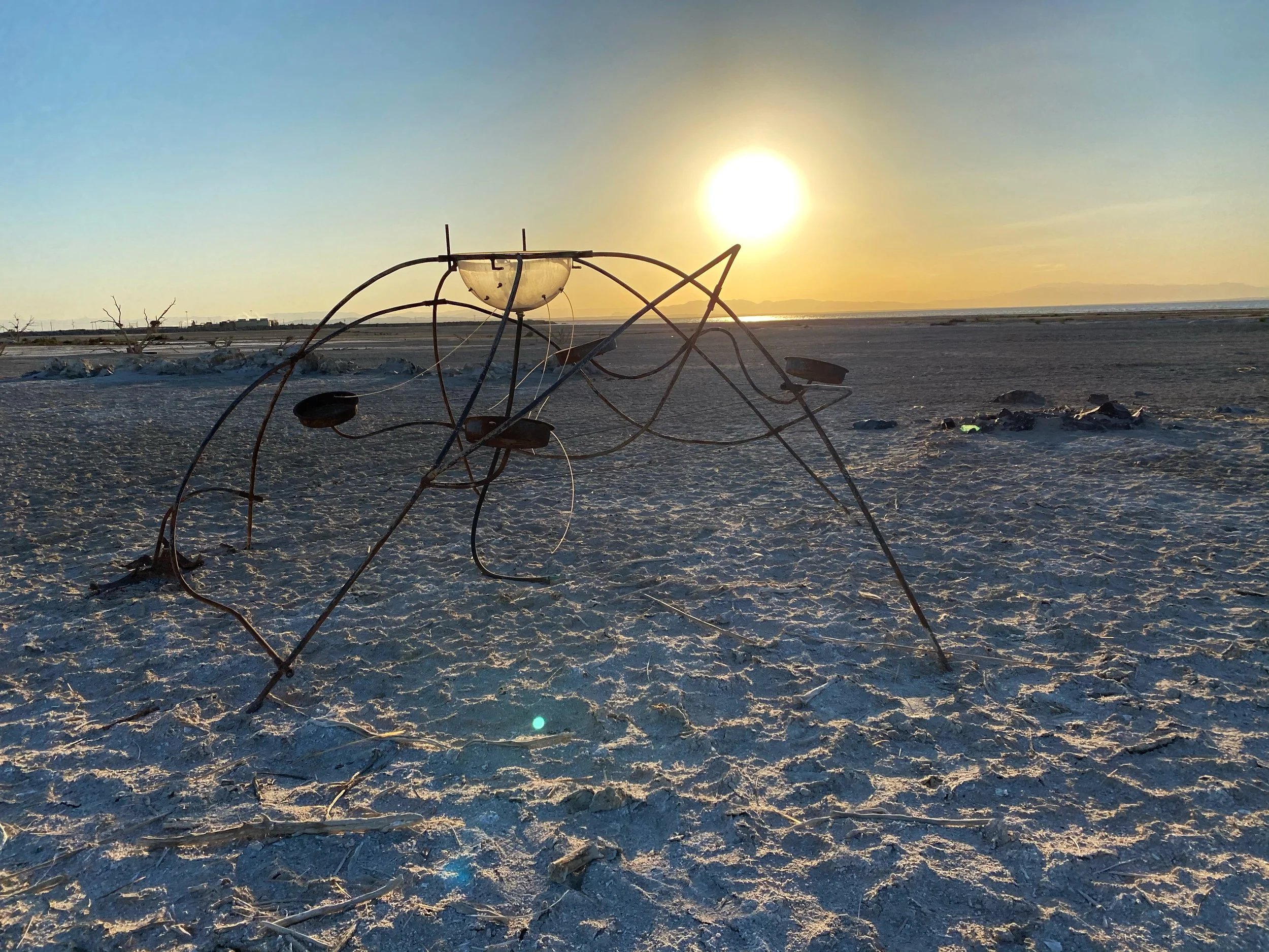 Collaboration with UC San Diego students of engineering to create a solar-powered, stand alone machine that precipitated salts and fertilizers passively from the Salton Sea. The region is a complex mix of migratory bird habitat, ecological periphery, and hazardous waste disposal. Fertilizers from regional agriculture collect in the lake causing toxic conditions for displaced bird populations and humans alike. A map of the surrounding area was created with salts precipitated by the machine. An essay on the project is available here. The project remains weathering along the dried up shore of the terminal lake. Video documentation below.